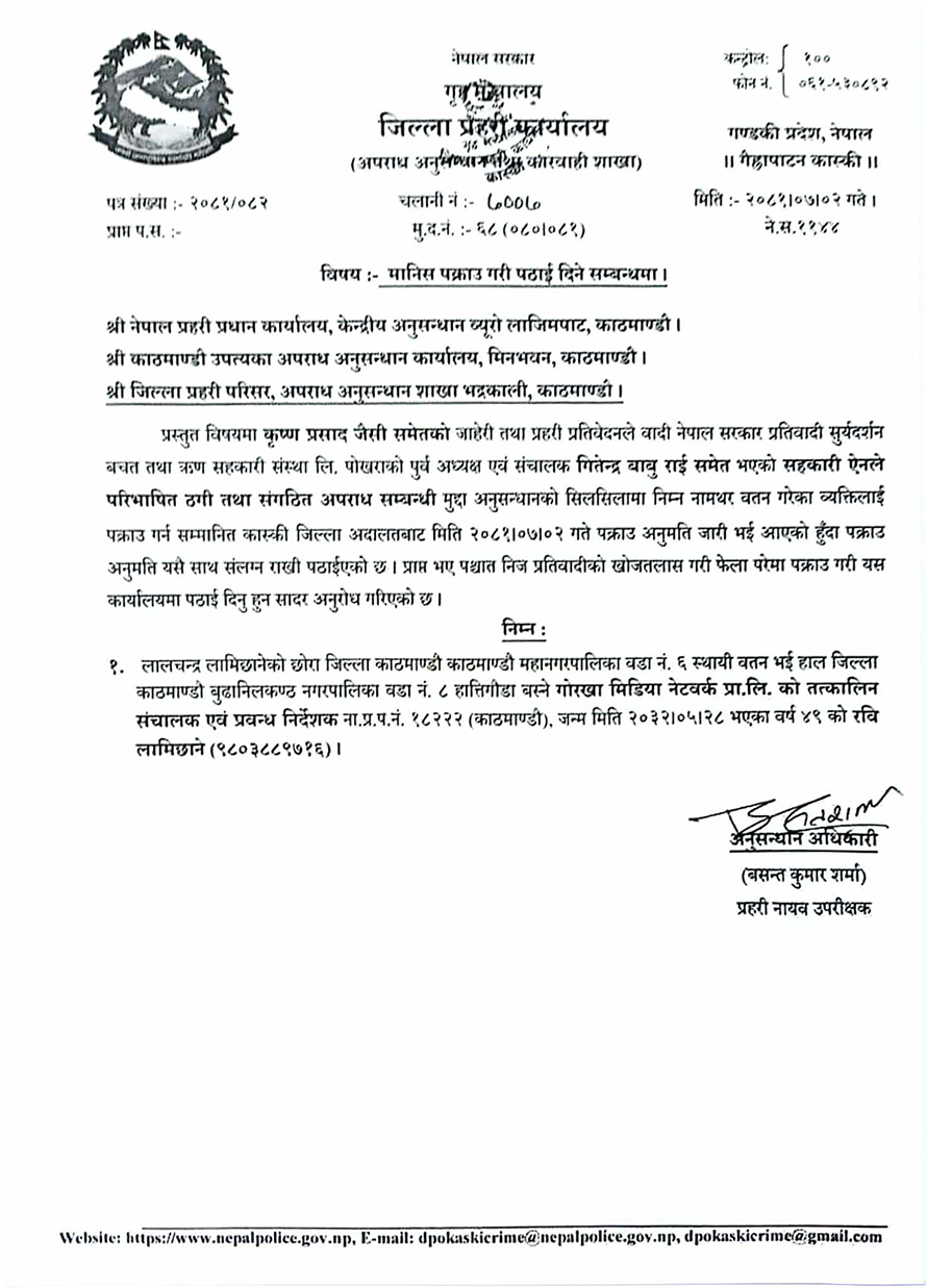 ग्यालेक्सी टेलिभिजनको सञ्चालक गोरखा मिडियामा सहकारीको रकम ल्याएर अपलचन गरेको आरोपमा कास्की प्रहरीले यतिबेला पूर्वडीआईजी छविलाल जोशीलाई हिरासतमा राखेर अनुसन्धान गरिरहेको छ । लामिछानेविरुद्ध प्रहरीले सहकारी ठगीसँगै संगठित अपराधको कसुरमा पनि अनुसन्धान गर्न अदालतबाट अनुमति लिएको खुलेको छ । कास्की प्रहरीले केन्द्रीय अनुसन्धान ब्यूरो (सिआइबी)सहितका प्रहरी निकायलाई पठाएको पत्रमा ‘ठगी तथा संगठित अपराध सम्बन्धी मुद्दा’मा अनुसन्धान गर्न लामिछानेलाई पक्राउ गरेर पठाइदिन भनिएको छ ।