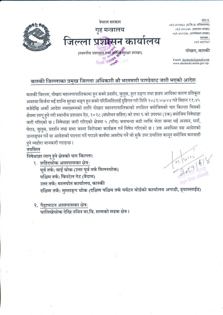 जिल्ला प्रहरी कार्यालय कास्की गैह्रापाटन पोखरा क्षेत्रलाई पनि निषेधित क्षेत्र घोषणा गरिएको छ । कास्की जिल्लाका प्रमुख जिल्ला अधिकारी भरतमणि पाण्डेले आइतबार मध्यान्ह निषेधित क्षेत्रको आदेश जारी गरेका हुन् । उनले जारी गरेको आदेशमा भनिएको छ‘कास्की जिल्ला, पोखरा महानगरपालिकामा हुन सक्ने प्रदर्शन, जुलुस, हुल दंगा तथा झडप आदिका कारण प्रतिकूल अवस्था सिर्जना भई शान्ति सुरक्षा भंग हुन सक्ने परिस्थितिलाई दृष्टिगत गरी मिति २०८१÷०७÷०४ गते बिहान ११ः४५ बजेदेखि अर्को आदेश नभएसम्मको लागि पोखरा महानगर पालिकाको तपसिल बमोजिमको चार किल्ला भित्रको क्षेत्रमा लागू हुने गरी स्थानीय प्रशासन ऐन, २०२८ (संसोधन सहित) को दफा ६ को उपदफा (३क) बमोजिम निषेधाज्ञा जारी गरिएको छ ।’