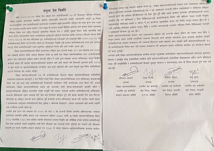 पोखरा महानगरपालिका स्थानीय तह कर्मचारी संगठन समन्वय समिति, स्थानीय तह कर्मचारी संघ पोखरा महानगर समिति, स्थानीय तह कर्मचारी संघ कास्की र स्थानीय तह कर्मचारी संघ गण्डकी प्रदेश समितिले संयुक्त विज्ञप्ति निकालेर हिजोको निर्णय फिर्ता लिई कर्मचारीलाई निर्वाध रुपमा काम गर्ने वातावरण मिलाउन माग गरेका छन् ।