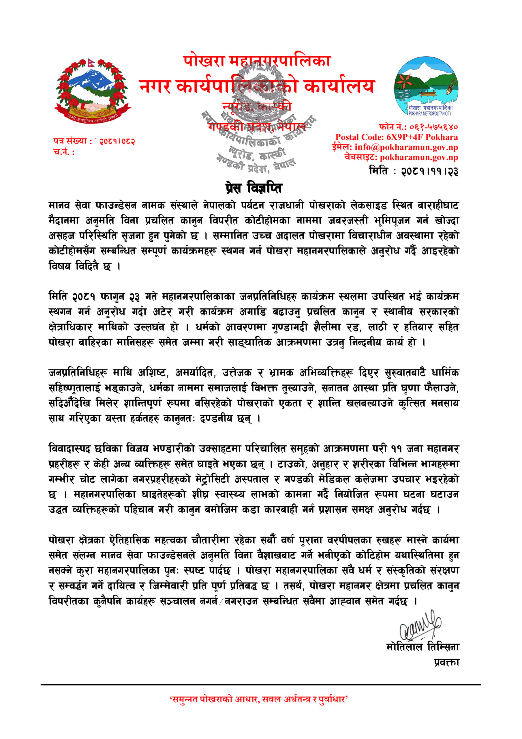 पोखरा महानगरपालिकाका प्रवक्ता मोतीलाल तिम्सिनाले जारी गरेको विज्ञप्तिमा महानगर क्षेत्रभित्रका सबै धर्म र संस्कृतिको संरक्षण तथा संवर्द्धन गर्ने प्रतिबद्धता जनाइएको छ। साथै, कानुन विपरीतका कुनै पनि कार्य नगर्न/नगराउन सम्बन्धित सबैलाई चेतावनी दिइएको छ।