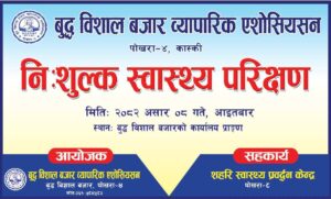 बुद्व विशाल बजार व्यापारिक एशोसियसनको आयोजना तथा शहरी स्वास्थ्य प्रवर्द्वन केन्द्र पोखरा ८ को सहकार्यमा गरिएको निःशुल्क स्वास्थ्य शिविरमा १५० जना लाभान्वित भएका छन् ।