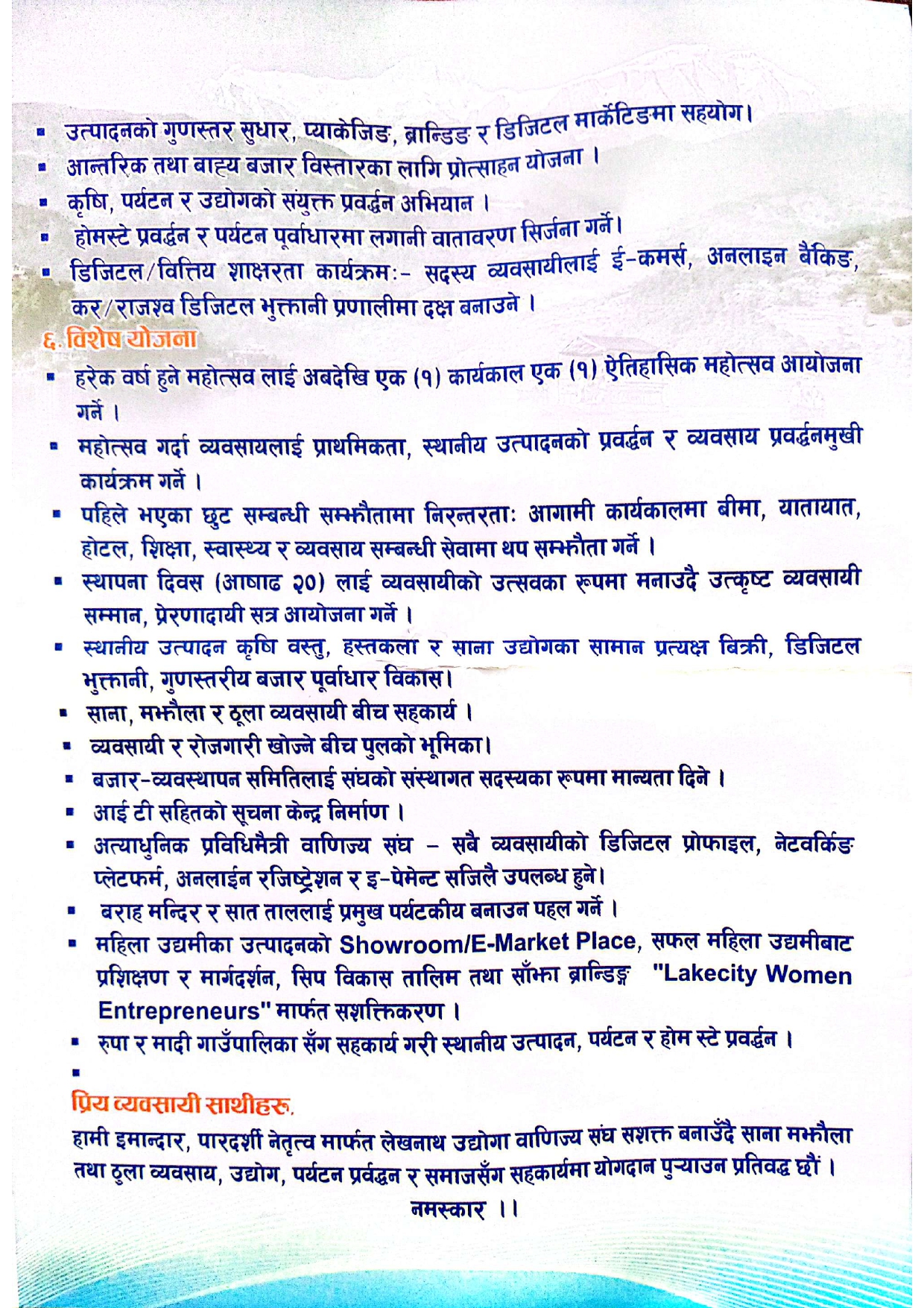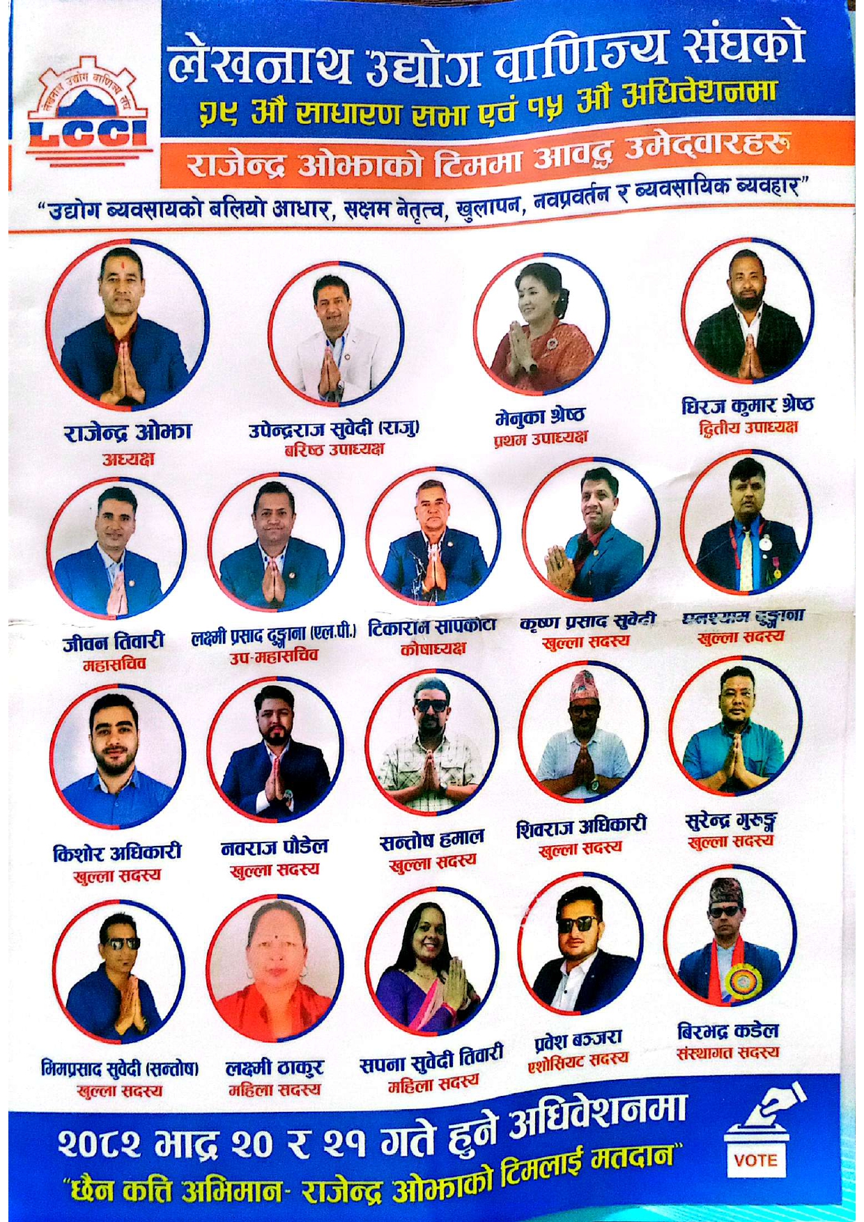अध्यक्षका उम्मदेवार ओझाको अध्यक्षमा भएको कार्यक्रममा स्वागत वरिष्ठ उपाध्यक्षका उम्मेदवार उपेन्द्रराज सुवेदी राजु र सञ्चालन महासचिवका उम्मेदवार जीवन तिवारीले गरेका थिए । पत्रकार सम्मेलनमा संघका पूर्वअध्यक्ष बलराम ढकाल र लक्ष्मीप्रसाद त्रिपाठी उपस्थित थिए । लेखनाथ उद्योग वाणिज्य संघको मतदाता संख्या २ हजार १९ रहेको अध्यक्ष विनोद श्रेष्ठले जनकारी दिए ।