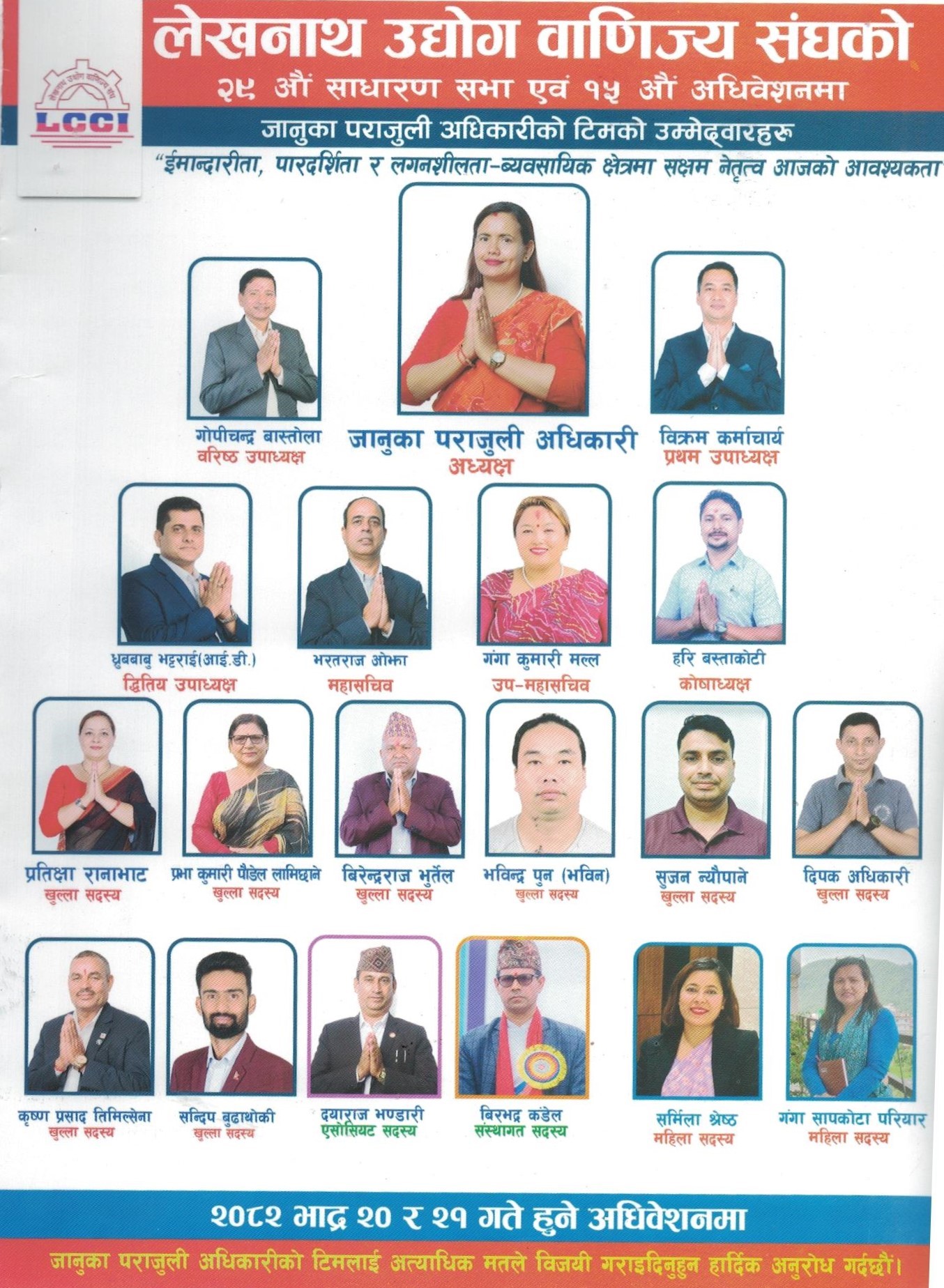 संघको अधिवेशन भदौ २० र २१ गते पोखरा महानगरपालिका वडा नम्बर २९ भण्डारढिकमा हुँदैछ । चुवनामा राजेन्द्र ओझा र जानुका पराजुली अधिकारी प्यानल बनाएर चुनावी मैदानमा उत्रिएका छन् । अध्यक्षका प्रत्यासी ओझा लेखनाथ उद्योग वाणिज्य संघको अहिलेको कार्यसमितिका वरिष्ठ उपवाध्यक्ष हुन भने अर्का अध्यक्षका प्रत्यासी अधिकारी महासचिव हुन । दुबै समूहले मतदाता भेटघाटलाई तीव्रता दिइरहेका छन् ।