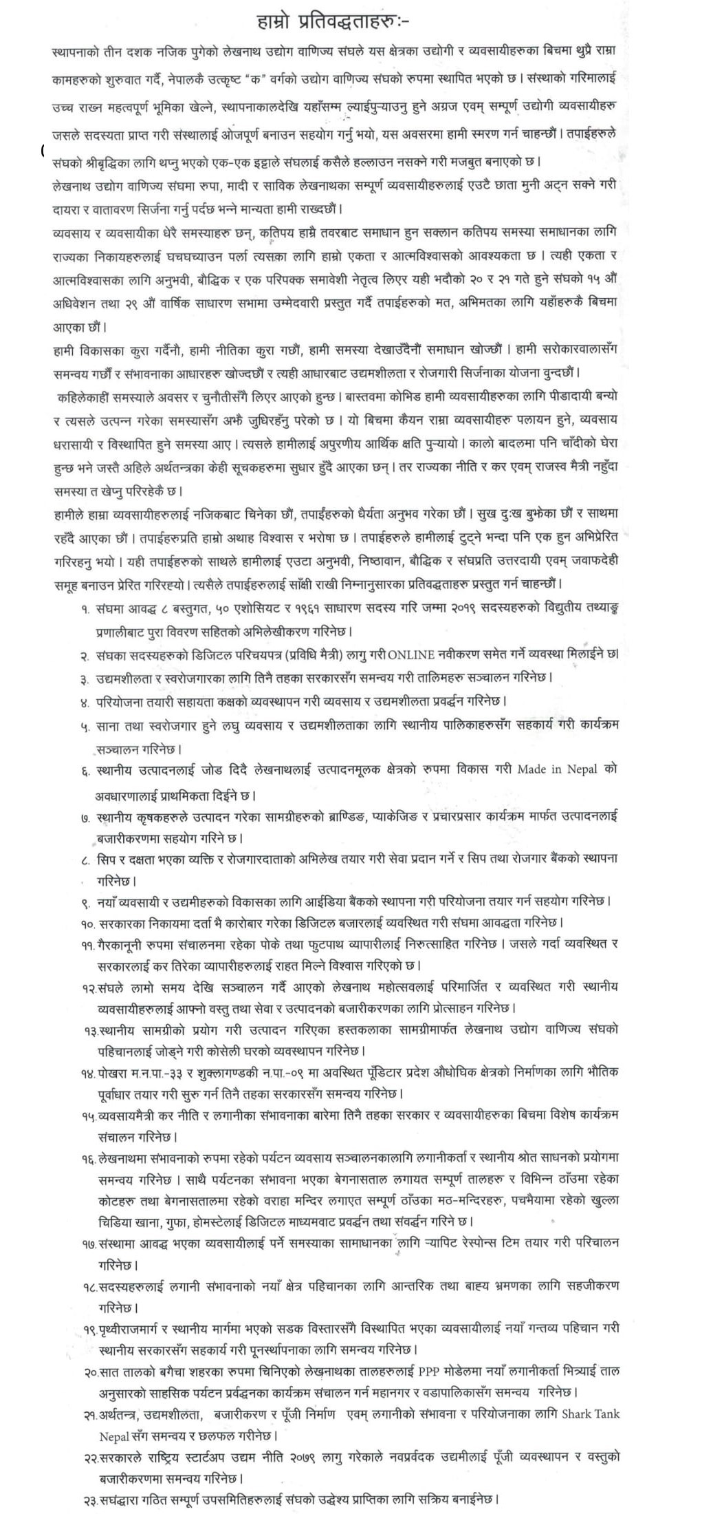 अध्यक्षका उम्मदेवार अधिकारीको अध्यक्षमा भएको कार्यक्रमको सञ्चालन महासचिवका उम्मेदवार भरतराज ओझाले गरेका थिए । लेखनाथ उद्योग वाणिज्य संघको मतदाता संख्या २ हजार १९ रहेको अध्यक्ष विनोद श्रेष्ठले जनकारी दिए । ओझा समूहले गत भदाै ५ गते पत्रकार सम्मेलन गरेर प्रतिवध्दता पत्र सार्वजनिक गरेको थियो ।