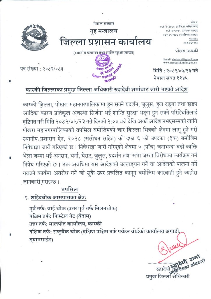 प्रमुख जिल्ला अधिकारी रुद्रदेवी शर्माद्वारा हस्ताक्षरित सूचना अनुसार, २०८२ असार २३ गते दिउँसो २ बजेदेखि लागु हुने गरी स्थानीय प्रशासन ऐन, २०२८ (संशोधन सहित) को दफा ६ को उपदफा (एक) बमोजिम निषेधाज्ञा जारी गरिएको हो।