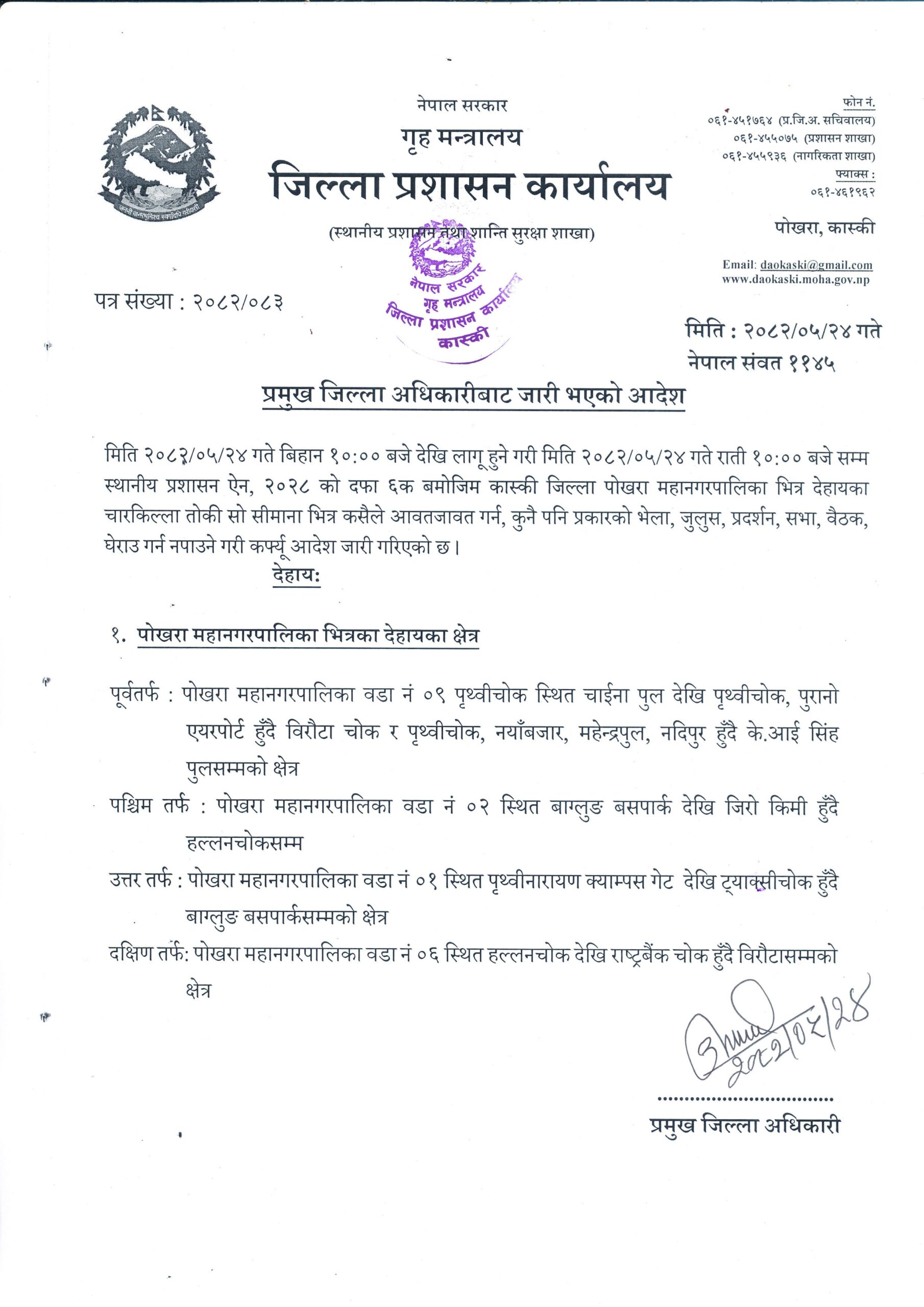 जिल्ला प्रशासन कार्यालय कास्कीले जारी गरेको कर्फ्यु आदेश