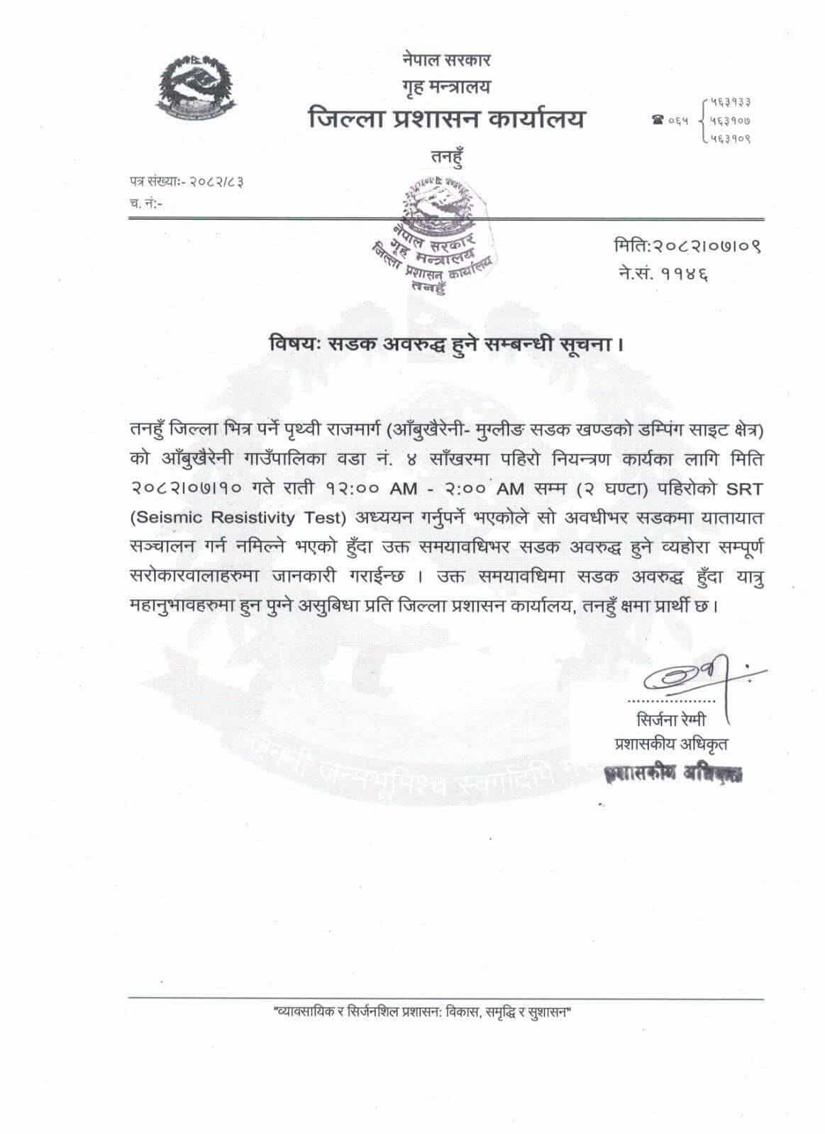 तनहुँ । पहिरो पन्छाउनु पर्ने कारण आज राति पृथ्वीराजमार्गको आबुखैरेनी सडक खण्ड २ घण्टा बन्द हुने भएको छ । जिल्ला प्रशासन कार्यालय, तनहुँद्वारा जारी सूचना अनुसार आबुखैरेनी गाउँपालिका- ४, साखरमा पहिरो पन्छाउनका निम्ति आज राति १२ देखि २ बजेसम्म सडक बन्द गर्न लागिएको हो ।