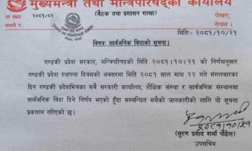 पोखरा । तामाङ समुदायको महान् पर्व ‘२८६१ औं सोनाम ल्होसार’ को अवसरमा गण्डकी प्रदेशका प्रमुख डिल्लीराज भट्टले शुभकामना सन्देश जारी गर्नुभएको छ । आपसी सद्भाव, प्रेम, भातृत्व, सहिष्णुता र एकताको पर्वको रुपमा लिइने सोनाम ल्होसारले नेपालको मौलिक संस्कृतिको संरक्षण तथा सम्बद्र्धनमा योगदान पु¥याएको भट्टले उल्लेख गर्नुभएको छ । शुभकामना सन्देश मार्फत् प्रदेश प्रमुख भट्टले भन्नुभएको...