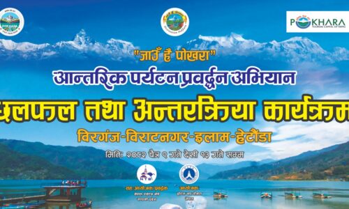 पोखरा । आन्तरिक पर्यटन प्रबद्र्धनको मुख्य उद्धेश्य बोकेर यसपटकको जाउँ है पोखरा अभियान पूर्वी नेपालका विभिन्न शहरबाट सुरु हुँदै छ । यही चैत ९ देखि १३ गतेसम्म संचालन हुने अभियान अन्तर्गत वीरगंज, विराटनगर, पशुपतिनगर र हेटौंडालाई छनोट गरिएको छ । पोखराका होटलकर्मी, पर्यटन व्यवसायी र संचारकर्मी संलग्न हुने अभियान अन्तर्गत पत्रकार सम्मेलन, छलफल र अन्तरक्रिया,...