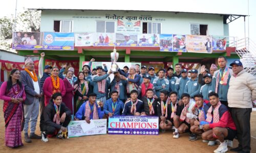 पोखरा । पोखरामा भएको मनोहर कप तेस्रो क्लब स्तरीय खुला पुरुष भलिबल प्रतियोगिताको उपाधि आयोजक टोलीले जितेको छ ।मनोहर क्लबको आयोजनामा पोखरा–१४ मनकामना टोलको खेल मैदानमा शनिबार भएको फाइनल खेलमा पोखरा युनाइटेडलाई ३–० को सोझो सेटमा पराजित गर्दै आयोजक टोलीले उपाधि रक्षा गरेको हो । आयोजक टोलीले पहिलो सेट २५–१६, दोस्रो सेट २५–२२ र तेस्रो...